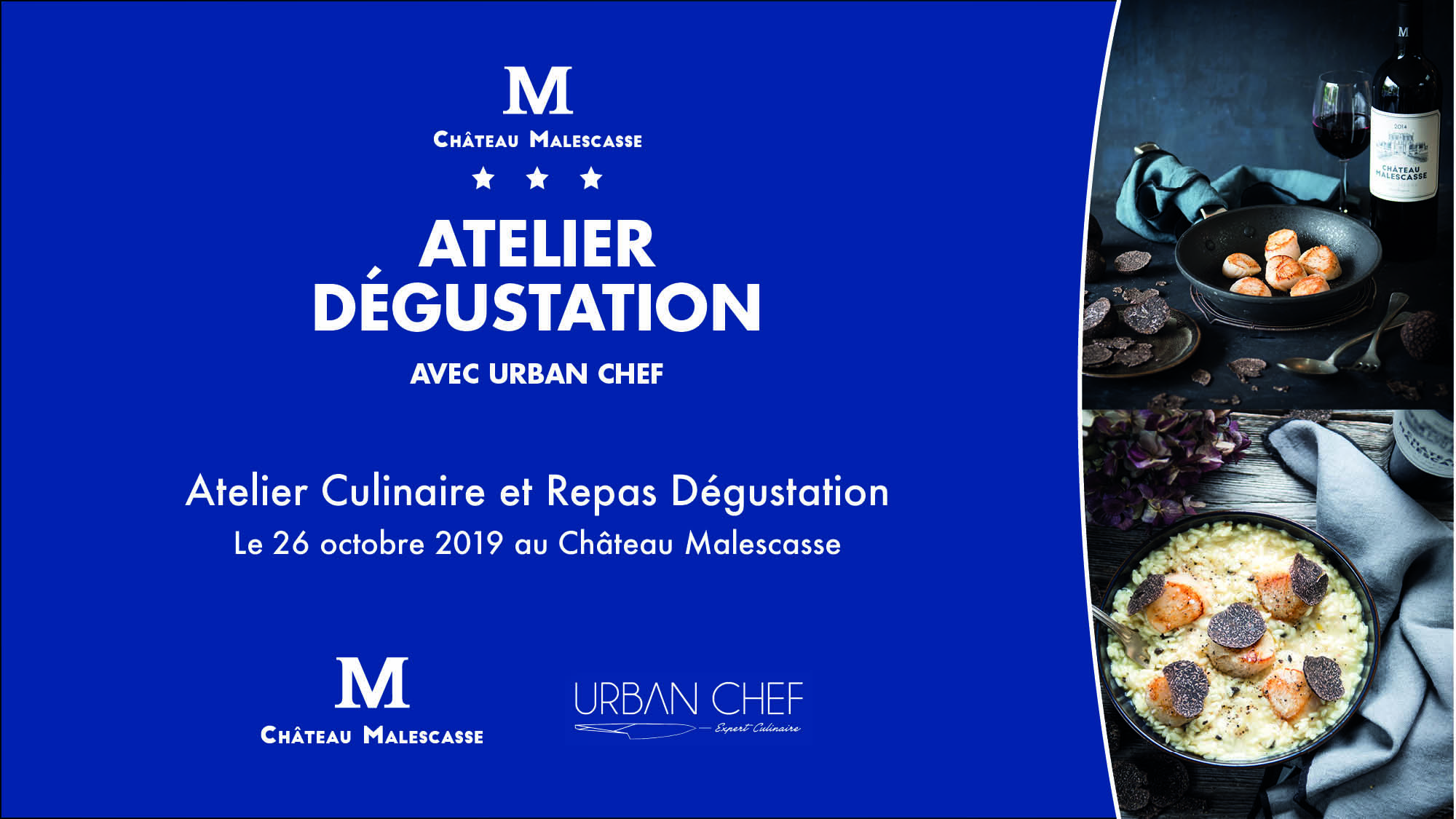 Laissez-vous tenter par une expérience culinaire inédite, dans un prestigieux Château du Haut-Médoc, le Château Malescasse. En partenariat avec les talentueux bordelais d’Urban Chefs, nous vous invitons à créer et à déguster un repas gastronomique lors d’un atelier culinaire qui se tiendra samedi 26 octobre 2019 à Malescasse. L’espace d’une journée, vous vous glisserez dans la peau d’un chef et serez guidés par le maestro Jérôme Oillic. Un voyage culinaire à vivre en famille ou entre amis, suivi d’une visite du domaine Château Malescasse.